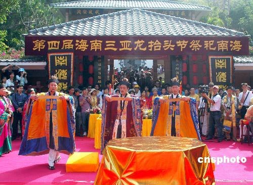 3月9日是中國農歷二月初二,民間傳統的龍抬頭節,中國各地都有不同的習俗祭龍祈福。海南因四面環海,百姓對此節日更顯重視。第四屆海南三亞龍抬頭節祭祀南海暨三亞“藍絲帶”海洋保護海南行首發式當天在三亞南山大小洞天景區隆重舉行。人們舉行莊嚴的道教儀式祭祀南海與南海龍王,祈禱風調雨順,國泰民安。中新社發 尹海明 攝