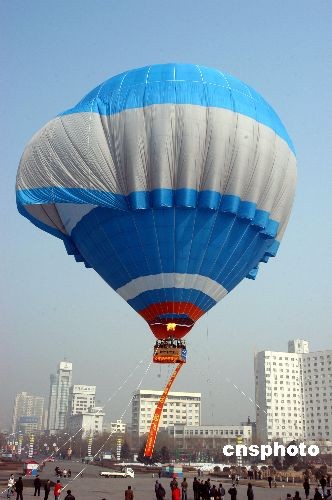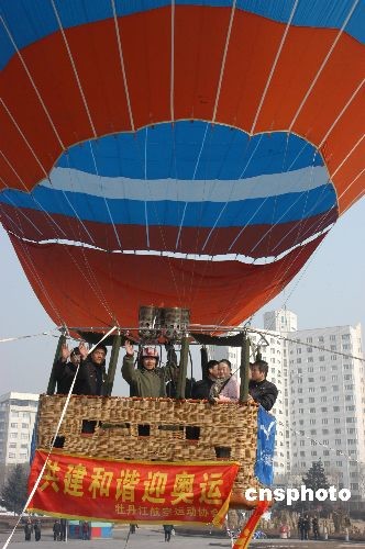 3月12日,黑龍江省牡丹江市航空協會舉辦的迎奧運熱氣球升空活動在江濱廣場舉行。一只體積達8000立方米、載荷2.2噸、亞洲最大的熱氣球在廣場升起,“共建和諧奧運”的條幅代表了航空愛好者的心聲。此次活動吸引了許多市民前來觀看。中新社發 張克非 攝