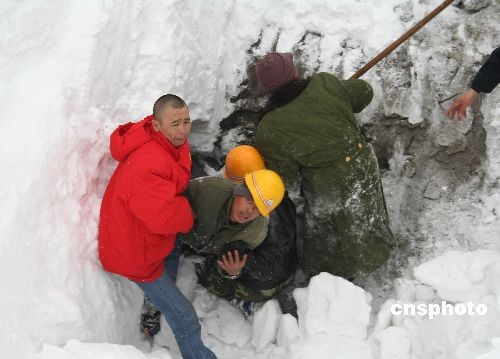 3月13日上午11點(diǎn)20分左右,位于新疆天山果子溝的西氣東輸二線工程一處隧道施工現(xiàn)場(chǎng)發(fā)生雪崩,目前已知有6名被困在隧道內(nèi)的工人獲救。由于隧道口被大雪掩埋,被困人數(shù)不詳,搜救工作仍在持續(xù)中。圖為現(xiàn)場(chǎng)救援人員救出一名被困工人。中新社發(fā) 馬耀林 攝