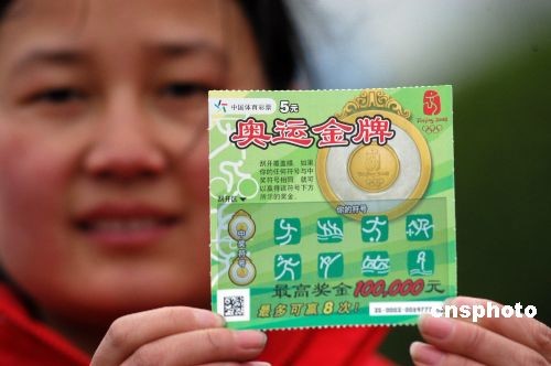 2008年3月23日,山東省濰坊市在該市風箏廣場舉辦“奧運彩票與圣火同行”奧運彩票“頂呱刮”首發儀式。當日,奧運彩票“頂呱刮”在濰坊率先上市。據了解,該奧運彩票為國內首創即開即兌型體育彩票。此次上市的奧運即開型體育彩票在技術、玩法及設計上均區別于以往傳統的即開彩票,一張彩票最多有12次中獎機會,最高獎金可達25萬元。“頂呱刮”奧運體育彩票將于3月24開始在山東、江蘇、浙江、河北四省試點銷售。 中新社發 王志德 攝