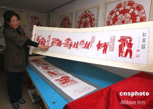 4月22日,山東高密市剪紙高人鄧輝講解她根據高密籍作家莫言小說《紅高粱》故事情節創作的剪紙作品。作為“中國民間藝術之鄉”的高密,是晏嬰、鄭玄、劉墉“三賢”的故鄉,高密茂腔、撲灰年畫、聶家莊泥塑、高密剪紙“四寶”,已被列入國家級非物質文化遺產保護名錄。 中新社發 趙雋 攝