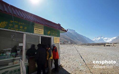 4月29日,位于西藏珠峰大本營絨布新聞中心的中國珠穆朗瑪峰臨時郵政局,不少采訪北京奧運會火炬接力珠峰展示活動的中外記者前來購買具有珠峰特色的北京奧運會紀念品。中新社發 盛佳鵬 攝