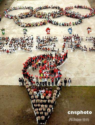 4月28日下午,四川省華鎣市古橋初中、華鎣市職業中學、華鎣市國家稅務局等部門的1500多名學生、教職員工,一起組成“祝奧運成功”五個大字及火炬、五環、福娃等奧運圖案,迎接北京奧運會倒計時100天的到來。 中新社發 邱海鷹 攝