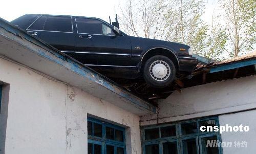 5月6日,在吉林延邊一處公路路面高于兩側(cè)房屋的特殊路段,一輛轎車被大風(fēng)吹到路邊低處房屋的屋頂上。當(dāng)日,吉林省延邊州遭大風(fēng)突襲,瞬時最大風(fēng)力達(dá)到十一級,為延邊歷史上少有。中新社發(fā) 秦俑 攝