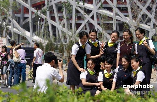 2008年5月8日上午,人們在“鳥巢”拍照留念。當天中國登山隊隊員將奧運圣火成功送上珠峰,創造了奧運圣火首次登頂世界最高峰的紀錄。北京國家體育場(“鳥巢”)周圍聚滿了市民和各地游客,人們紛紛到此拍照留影,紀念北京奧運圣火成功登頂珠峰。一些國外媒體特意在報道“鳥巢”周圍喜慶的奧運氣氛。中新社發 馬小剛 攝