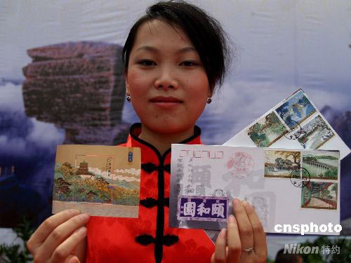 5月10日,印江郵政工作人員展示《頤和園》郵票。當天,《頤和園》特種郵票一套6枚和1枚小型張在貴州印江首發, 印江土家族苗族自治縣舉辦了慶祝《頤和園》特種郵票發行活動。《頤和園》郵票內容是十七孔橋、長廊、石舫、諧趣園、玉帶橋、后湖,小型張是佛香閣。這套郵票是繼長城、故宮、天壇后發行的又一套北京名勝題材郵票。《頤和園》三個字,是清代書法家、貴州印江的嚴寅亮所書。中新社發 陳曉嵐 攝