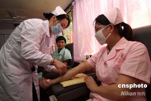 5月11日,湖南婁底市眼科醫(yī)院的護士在獻血。“5.12”國際護士節(jié),婁底市眼科醫(yī)院、婁底口腔醫(yī)院、東方醫(yī)院的100多位護士,在節(jié)日前無償獻血。中新社發(fā) 郭國權(quán) 攝