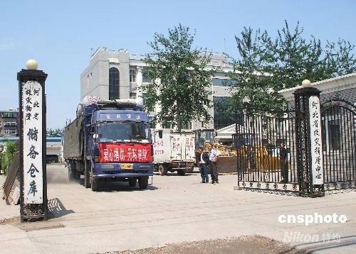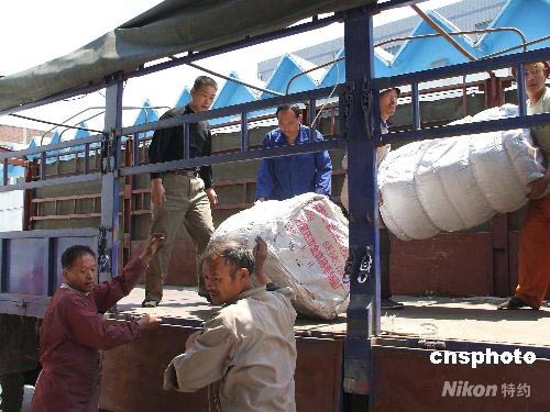 四川省汶川縣發生7.8級地震后,災區人民的安危牽動著河北民眾。13日下午,河北省民政廳緊急調運了一萬床棉被、一萬件棉衣和一萬件棉褲援助災區。工人們將救援物資裝車。滿載著救援物資的卡車駛出河北省救災物資儲備倉庫,直奔災區。中新社發 顧文娜 攝