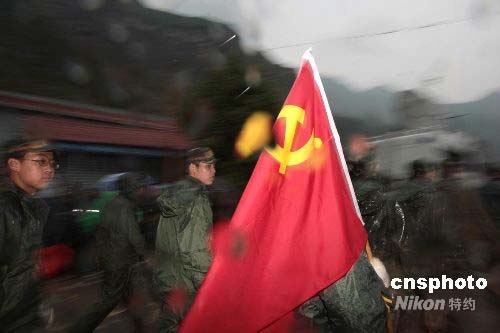 5月13日,中國空降兵6500多名官兵分別乘坐空軍遠輸機奔赴四川重災區(qū),分五路兵力,分別在什邡、德陽、茂縣、等重災區(qū)展開救援。圖為共產(chǎn)黨員沖在搶險救災第一線。中新社發(fā) 譚超 攝