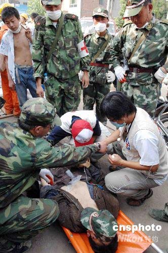 5月15日下午,解放軍某部在北川地震重災區任家坪村救出幸存者。中新社發 陳文 攝
