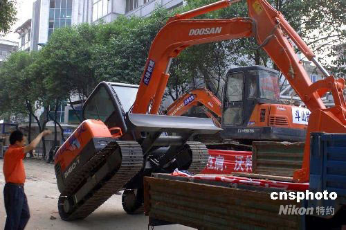 2008年5月15日,地震災(zāi)區(qū)都江堰市危樓排險工作正在進行中。目前來自成都市企業(yè)的志愿抗震救災(zāi)隊伍攜帶大型機械車輛開進都江堰市區(qū),與解放軍部隊一起展開危樓居民區(qū)的排險、救災(zāi)、防疫工作。圖為成都市一企業(yè),派數(shù)量可觀的大小挖掘機和破損機進入江堰市危樓疏散區(qū)。汶川7.8級地震,給都江堰市帶來巨大破壞。目前危樓居民區(qū)疏散、安置工作已展開,取得一定成果。中新社發(fā) 鄒憲 攝