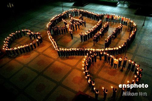 5月15日,在安徽省含山縣第二中學,中學生手捧蠟燭組成愛心將“汶川”兩字包圍。當晚,安徽省含山縣第二中學開展主題為“燭光祈心愿、愛心獻汶川”的祈福和捐款獻愛心活動,在自發捐款的同時,近千名中學生點燃蠟燭,組成“愛心包圍汶川”的圖案,為在四川汶川縣強烈地震中遇難的同胞寄托哀思,同時為幸存者默默祝福,祝愿災區群眾早日度過難關。中新社發 程千俊 攝