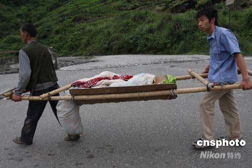 四川大地震,從都江堰到汶川縣映秀鎮(zhèn)沿線民房和交通受損嚴(yán)重,許多受困的居民紛紛離家趕往安全地點,也有許多居民想回家看往地震區(qū)的親人。圖為14日,友誼隧道附近的災(zāi)民把受傷的孩子運(yùn)往外面進(jìn)行醫(yī)治。中新社發(fā) 黃榮 攝