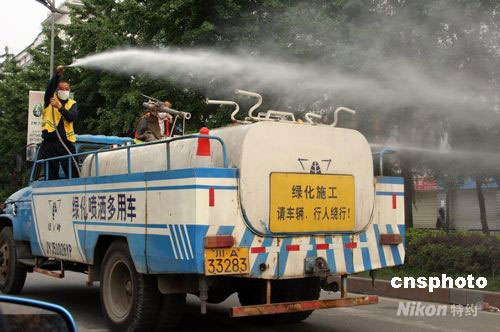 5月16日,四川都江堰市對市區及災民安置點周邊環境進行消毒,加強防疫工作。中新社發 張雷 攝
