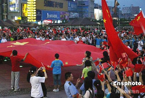 5月16日,湖南長沙市紅十字會、湖南公益聯盟網共同發起的“國旗揮舞力量 湖南鼓舞汶川”大型公益活動在長沙市舉行。一面一百平米的國旗在人群中傳遞前行,國旗激起了人們心底的愛國熱情,市民紛紛掏出善款捐獻災區。中新社發 張家根 攝