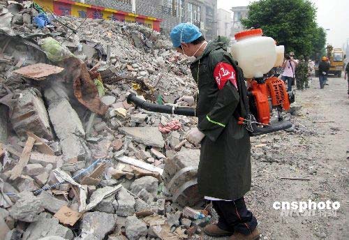 五月十七日,是汶川地震發生時間第六天,地震災區都江堰市最大的市場荷花池市場已開始用大型挖掘機、裝載機清理倒塌的樓房和廢墟,并有專業人員進行防疫消毒。中新社發 周丹鈺 攝