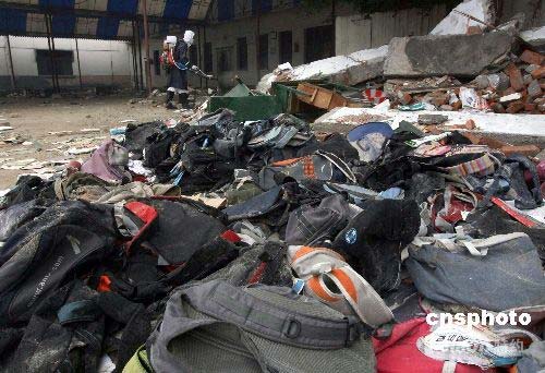 五月十七日,在汶川大地震中垮塌的灌縣聚源中學廢墟奪取了五十多位師生的寶貴生命,疾病控制人員今天開始對殘留的學生書包噴灑消毒藥。中新社發 賈國榮 攝