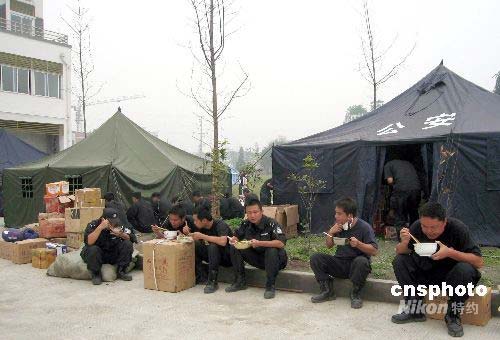 五月十七日,是汶縣地震發生時間第六天,地震災區都江堰市最大的市場荷花池市場已開始用大型挖掘機、裝載機清理倒塌的樓房和廢墟,并有專業人員進行防疫消毒。在都江堰市幸福大道邊上一塊空地上,救援人員已達起了五百余座帳篷,用于安置附近災民,災民明天開始進駐,可容納三千人左右。中新社發 周丹鈺 攝