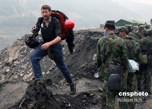 一名美國《紐約時報》的攝影記者,5月17日晚通過解放軍工兵部隊剛剛打通的由都江堰至四川省汶川大地震核心重災區映秀鎮的簡易公路進入映秀鎮采訪。四川省汶川地區發生大地震,引起國際媒體的高度關注,災區內經常可以看到外國記者的身影。中新社發 任晨鳴 攝