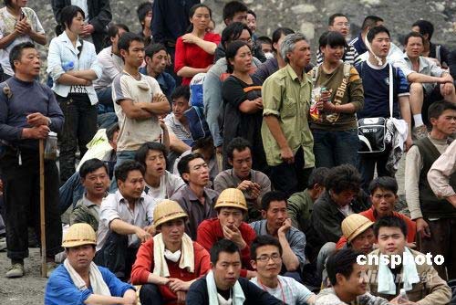 5月17日,四川汶川縣漩口鎮(zhèn)地震災民等待解放軍官兵用沖鋒舟運送他們到都江堰。中新社發(fā) 張雷 攝