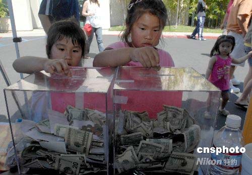 當地時間五月十七日,四川大地震發生后的第一個周末,在洛杉磯地區工作生活的普通華人華僑頂著華氏一百度的高溫走上街頭,為遠隔萬里的災區同胞默默捐出一張張現金和支票。短短六個小時的街頭募捐活動共籌得四十萬美元。圖為小姐妹將積攢的零花錢全部捐獻給地震災區。中新社發 張煒 攝