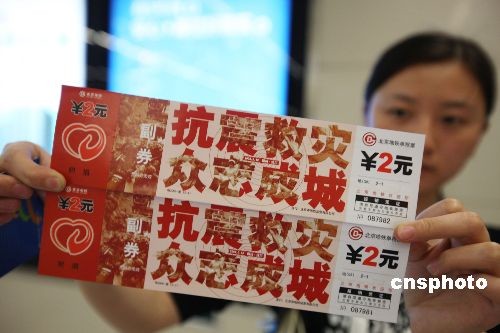 5月18日,北京地鐵首次發(fā)行的“特種”愛心附捐車票出現(xiàn)在北京地鐵所有車站售票臺(tái),這套附帶為地震災(zāi)區(qū)捐款獻(xiàn)愛心的文化車票受到了市民的青睞,北京地鐵公司將把附捐的40萬元愛心款全部轉(zhuǎn)交中國(guó)紅十字會(huì)。這套愛心附捐車票發(fā)行總量為10萬套,每張車票售價(jià)4元,其中包括2元捐給災(zāi)區(qū)的款項(xiàng)。中新社發(fā) 老羅 攝
