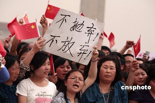 2008年5月20日,全國哀悼日第二天,民眾在北京天安門廣場揮舞著國旗,為四川加油,希望災民早日度過難關。中新社發 崔奉霞 攝