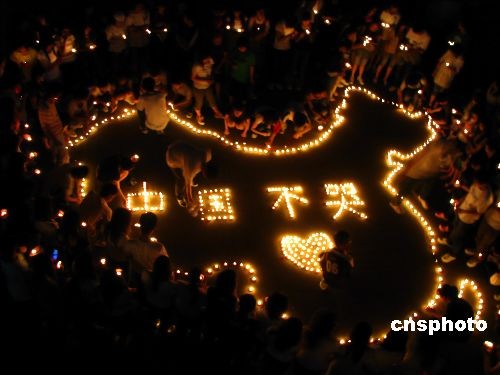 5月20日,全國悼念日第二天,“悼念四川汶川大地震遇難同胞”淮陰師范學院文通學院同學自發在學校操場為遇難同胞祈福,“中國不哭”中國加油,成百上千支蠟燭點燃了同學們的祝福,希望災區人民早日從災難中恢復,重建家園。