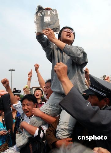 5月19日,全國(guó)哀悼日,民眾在北京天安門廣場(chǎng)揮舞著國(guó)旗,為四川加油,希望受災(zāi)民眾早日度過難關(guān)。中新社發(fā) 李京生 攝