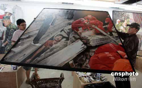 5月25日,參加嘉德義賣的油畫家在北京加緊創作以汶川大地震為主題的巨作。中國嘉德國際拍賣有限公司將于5月27日在北京為四川地震災區舉行義拍活動。在眾多拍品中,一幅由30位名家集體創作的,2米高、20多米長的抗震救災主題油畫成為最大熱點,該油畫由寫實畫派名家艾軒、楊飛云、王沂東領銜創作,以巨幅作品的形式表現全國人民眾志成城、奮力抗災的感天動地的悲壯情景。中新社發 楊可佳 攝