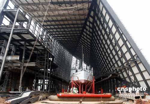 5月25日,經過10天的搬遷,一代名艦中山艦終于抵達武漢金口中山艦博物館內,并將在此永遠安家落戶,預計明年正式對外開放。中新社發 張暢 攝