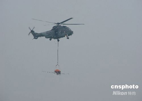 5月25日下午,香港特區政府飛行服務隊的“超級美洲豹”開始對外掛噴灑系統進行安裝并試車。外掛噴灑系統是一個米黃色球體,內裝900公升液體,懸掛在飛機下部200米處,工作人員在空中通過操作盤控制外掛噴酒系統指令開起閥門,將液態藥物灑下!俺壝乐薇边m用山地飛行,在地形復雜、山勢險惡的四川地震災區將發揮其重大作用。中新社發 張鈺昱 攝