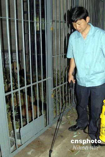 圖:北京動(dòng)物園對(duì)臥龍奧運(yùn)大熊貓圈舍消毒