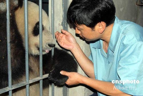 5月24日,來自四川臥龍的8只大熊貓平安抵達北京動物園,開始新的生活。此次進京的8只奧運大熊貓,是今年3月21日啟動的“2008四川臥龍大熊貓奧運北京行”投票評選活動中,由廣大網民從16只大熊貓里選出來的。這8只熊貓,雌雄各半,現在的年齡都在1歲9個月之間,屬亞成體,正是最活潑可愛的年華。臥龍飼養員在京對在地震中受驚嚇的熊貓美欣進行心理撫慰。中新社發 羅小韻 攝