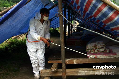 5月28日,為了防止大災(zāi)之后出現(xiàn)大疫,衛(wèi)生防疫已進(jìn)入地震災(zāi)區(qū)家家戶戶。圖為防疫人員在汶川大地震重災(zāi)區(qū)之一的彭州白鹿鎮(zhèn)噴灑消毒藥劑。中新社發(fā) 楊杰 攝