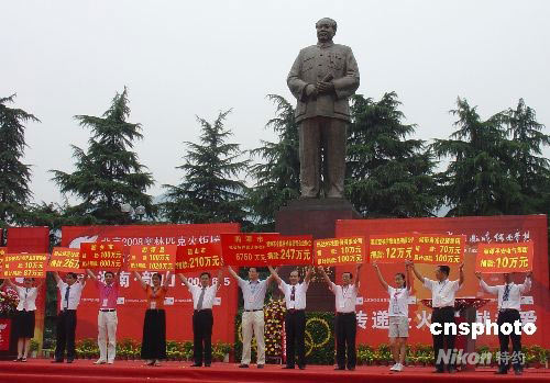 6月5日,奧運圣火湘潭、韶山傳遞結束儀式在韶山毛澤東銅像廣場舉行,韶山各界向四川汶川地震災區捐款。中新社發 肖前輝 攝