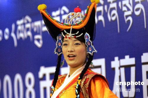 6月18日,美麗藏族女孩在北京熱情歌舞,為8月30日即將在拉薩舉辦的雪頓節做宣傳。中新社發 杜洋 攝