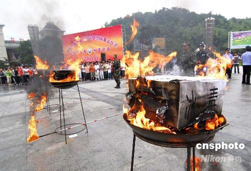 6月26日,國(guó)際禁毒日。浙江溫嶺市在東輝公園舉行廣場(chǎng)禁毒宣傳暨毒品焚燒儀式,焚燒海洛英、冰毒、麻古、搖頭丸等毒品20512克,總案值1600多萬(wàn)元。溫嶺市還舉行了圖片展覽和簽名儀式,向群眾宣傳禁毒。中新社發(fā) 吳鵬飛 攝