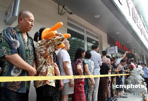 7月9日,北京,眾多市民在銀行門前排隊等候兌換奧運紀念鈔。由央行發行的600萬張10元面額奧運紀念鈔,9日與北京市民見面。北京市工商銀行、農業銀行、中國銀行、建設銀行、交通銀行5家商業銀行約300個營業網點面向社會兌換紀念鈔,規定每人僅限兌換一張。許多市民甚至連夜排隊等候。中新社發 盛佳鵬 攝