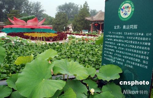 7月24日,兩名女孩在圓明園遺址公園內的荷花旁邊留影。奧運臨近,在圓明園第二十二屆喜迎綠色奧運荷花節期間,絢麗多姿的各類荷花品種達260多個品種,令前來游園的中外游客流連忘返。 中新社發 楊慧峰 攝