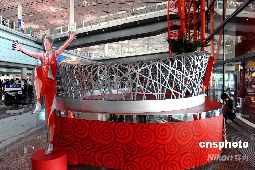 8月12日,北京首都機場T3航站樓搭建一處類似于“鳥巢”體育館的景觀,歡迎奧運賓朋。 中新社發 廖攀 攝