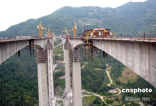 28日上午,湖北滬蓉西宜昌至恩施高速公路十二合同段龍?zhí)逗犹卮髽騽倮蠑n。龍?zhí)逗犹卮髽蛉L1182米,由中鐵十七局和湖北路橋有限責任公司聯(lián)合承建。主橋上部結構為全預應力混凝土懸澆連續(xù)鋼構箱梁,主墩采用雙肢變截面矩形空心墩,最大墩高178米,居世界同類橋梁墩高之最。中新社發(fā) 劉良偉 攝