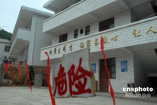 9月1日,受“8·30”地震余震影響,四川省攀枝花市決定所有中小學開學時間推遲一周,將于9月8日開學。圖為攀枝花市鹽邊縣和愛鄉中學一棟教學樓在地震中因受損嚴重,拉起紅色警戒線。中新社發 石雨 攝