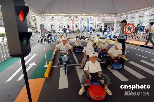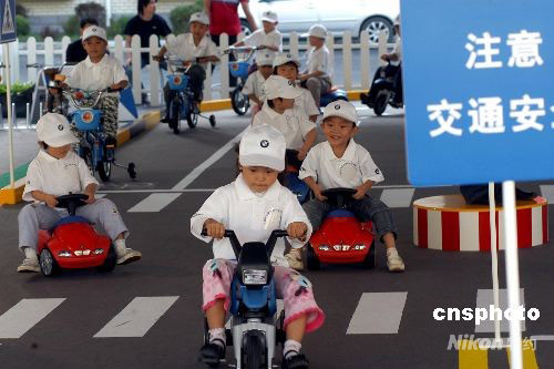 9月11日,為期三天的2008BMW兒童交通安全訓練營沈陽站在和平區少年宮開營。在BMW兒童交通安全主題公園里,十字路口、交通崗、紅綠燈、斑馬線、雙黃線、警示牌等一應俱全。來自沈陽多所幼兒園的80名孩子駕駛著玩具寶馬汽車、摩托車和自行車行駛在這一個“縮小版”的繁華街道上。中新社發 文契 攝