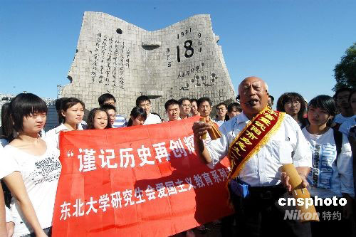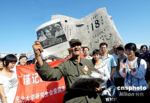 9月18日,許多當年抗日戰士、“九一八”事變受害者,紛紛聚集在遼寧沈陽“九一八”歷史博物館殘歷碑前,訴說慘痛歷史,對年輕一代進行愛國主義教育。中新社發 文契 攝