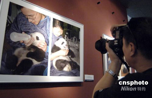 9月18日,《與大熊貓同在》攝影展在北京“大眾影廊”開幕,展示“5.12”汶川大地震后,四川臥龍保護大熊貓研究中心工作人員拍攝的近40幅攝影作品,記錄了救護國寶的一個個感人瞬間。震后出生在雅安碧峰峽基地的第一對雙胞胎熊貓寶寶照片,成為影展的焦點。中新社發 徐曦弋 攝