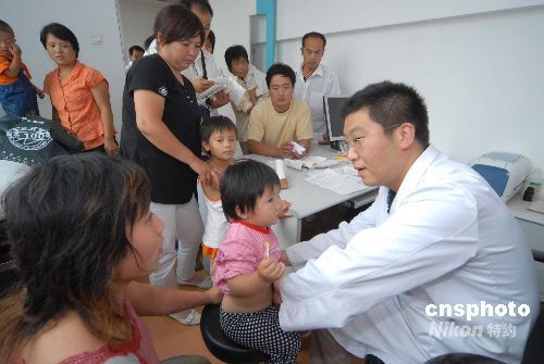 圖為食用過“問題奶粉”的小孩在山東濰坊市人民醫院查體。自含有三聚氰胺“問題奶粉”曝光后,濰坊市人民醫院成立了“問題奶粉”患兒就診專家小組,開通了“問題奶粉”患兒就診綠色通道,為前來檢查的兒童進行及時篩查診斷。中新社發 王曉光 攝