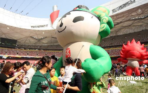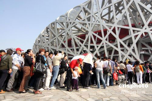 9月30日,“十一”國慶長假第二天,旅游黃金周進入高潮,到北京旅游的各地游客都渴望進入北京奧運會主體育場“鳥巢”,有幸購到參觀票的游客在鳥巢盡情玩耍拍照。中新社發 吳芒子 攝