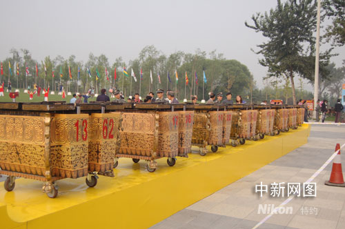 奧運開幕式道具—缶在北京朝陽國際旅游文化節上亮相,吸引游客駐足觀賞。張濛 攝