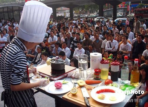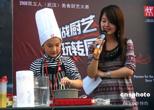 2008年10月1日,武漢市漢口航空路一廚藝大賽現(xiàn)場,11歲女童余秋萍上臺和成年人一起比賽烹調(diào)技藝。據(jù)了解,小學(xué)生余秋萍從9歲就開始學(xué)習(xí)廚藝,經(jīng)常在家炒菜做飯,認(rèn)為自己的手藝不錯,就報名參加了這次比賽。中新社發(fā) 孫新明 攝